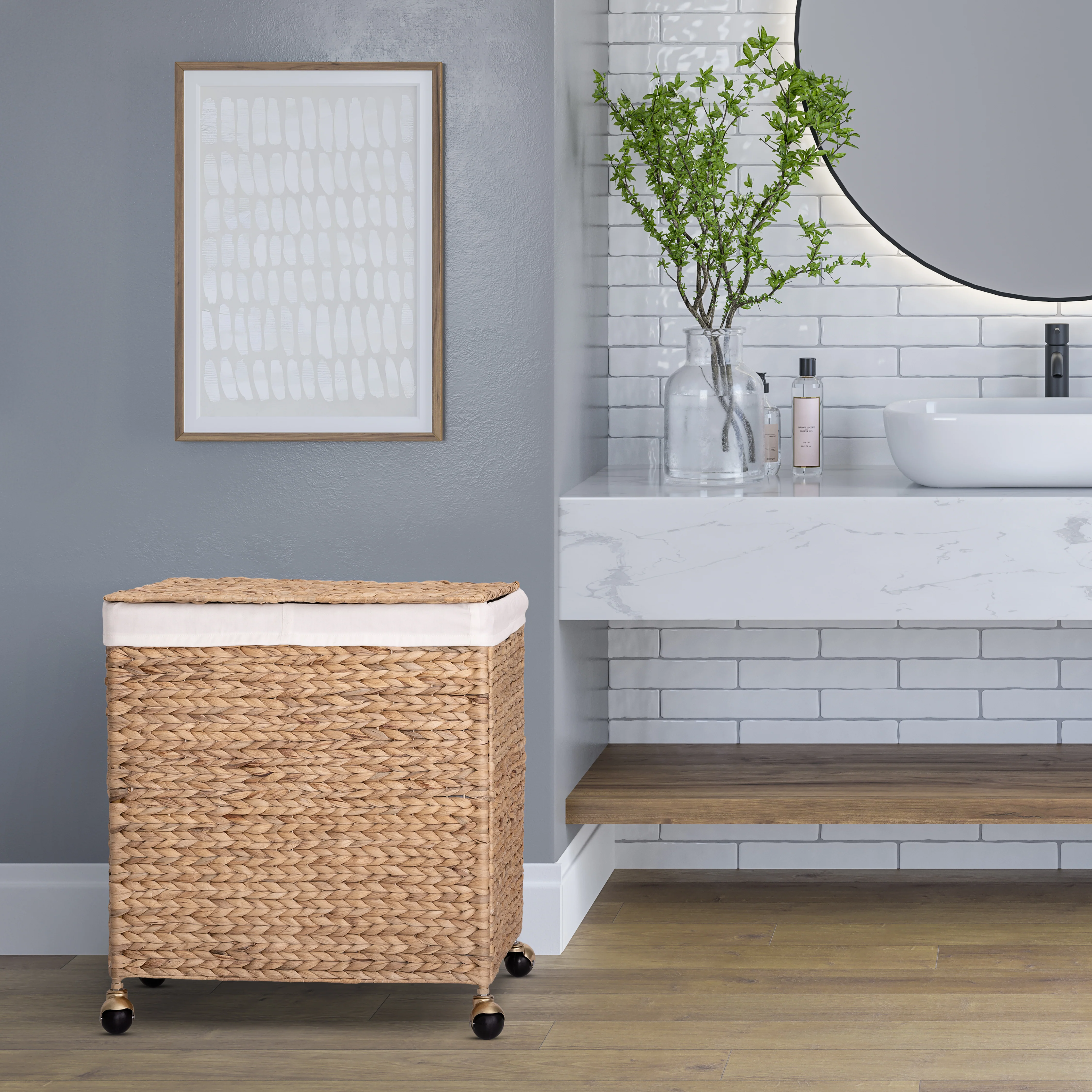 Natural Water Hyacinth Handwoven Lidded Double Laundry Hamper with Gold Sphere Casters